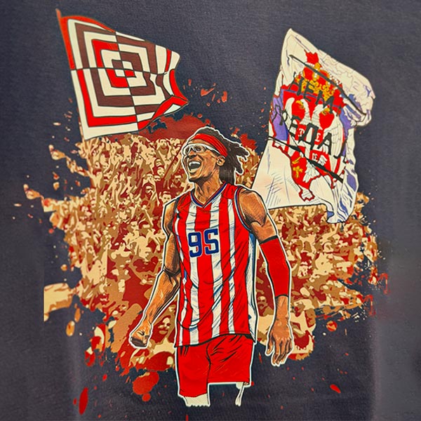 Majica Košarkaškog kluba Crvena zvezda kratkih rukava, окruglog izreza, napravljena od najudobnijeg materijala! Sigurni smo da će ovaj dizajn oduševiti naše verne navijače. Na prednjoj strani majice nalazi se Čima Moneke u crveno-belom dresu, iza koga stoje verni navijači koji će, bez sumnje, kao i do sada, biti najveći vetar u leđa tokom cele sezone. Ovaj nesvakidašnji i upečatljiv dizajn simbolizuje snagu tima i podršku sa tribina – nešto što svaki navijač ponosno nosi!