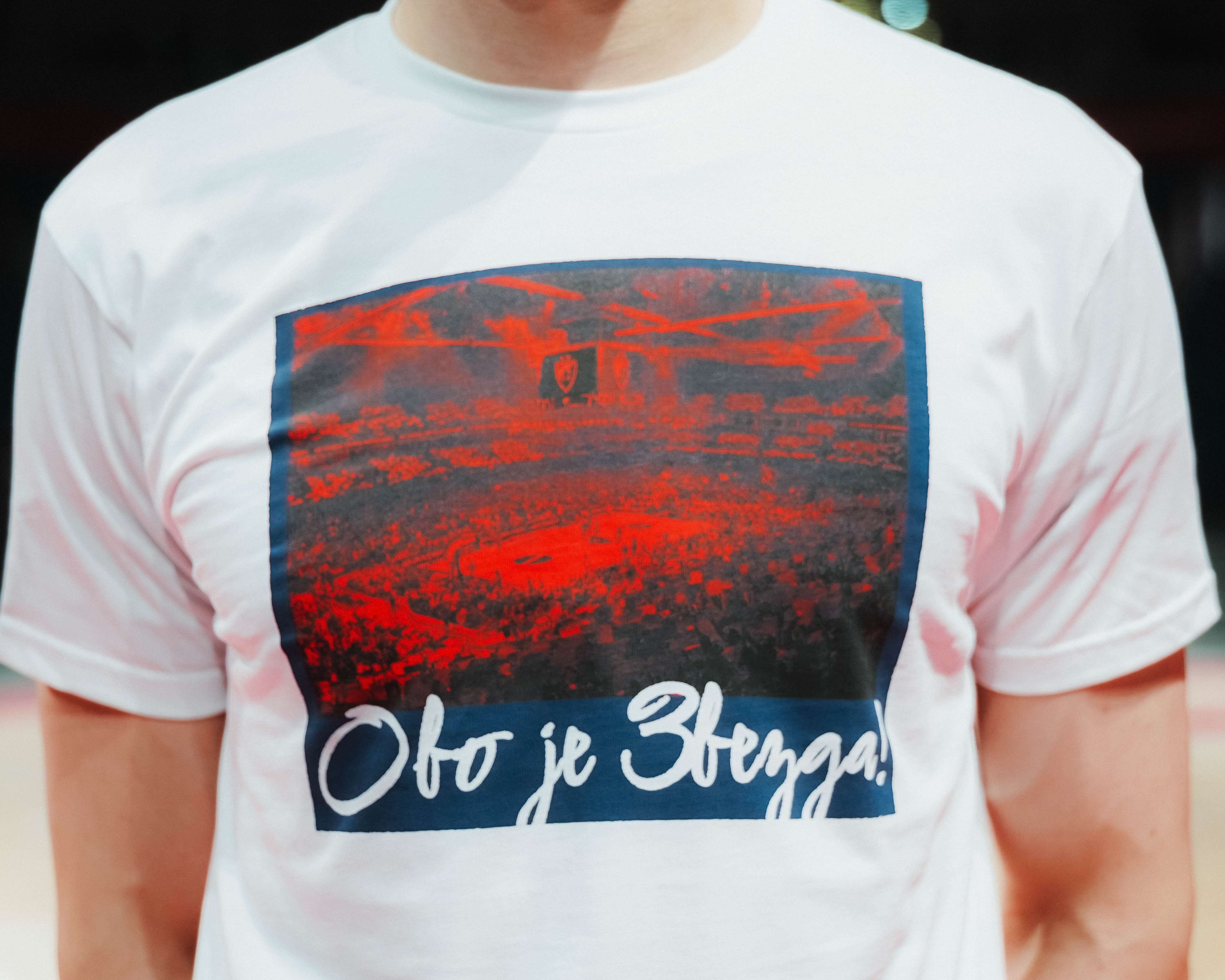 Na prednjoj strani majice nalazi se fotografija punih tribina Beogradske Arene – jedan od simbola našeg kluba. Nezaboravna atmosfera i vernost naših navijača prikazane su na ovom dizajnu. Ispod fotografije stoji natpis „Ovo je zvezda“, koji nosi jasnu poruku.